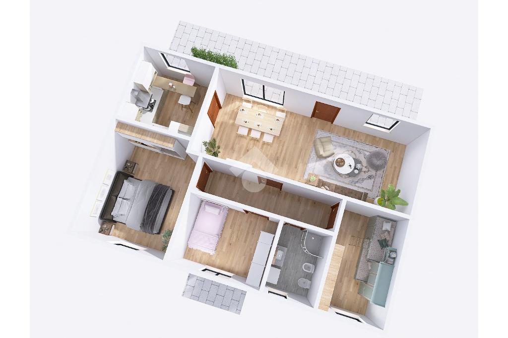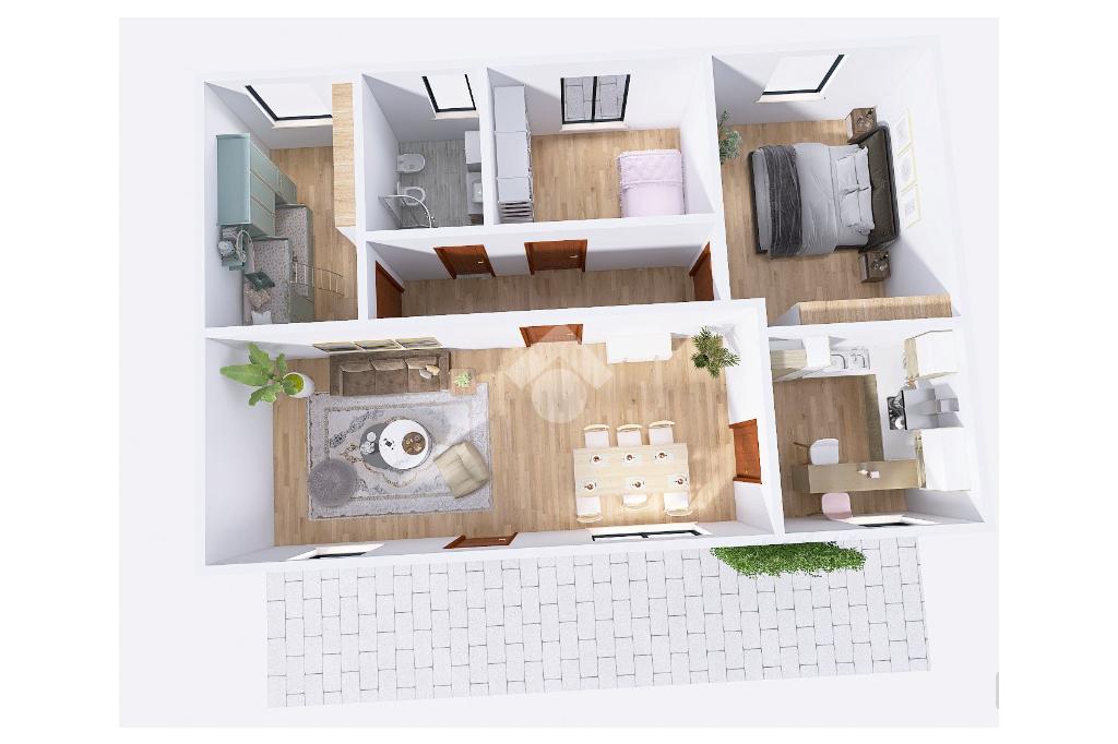All’ingresso, protetto dalla porta blindata, ci si imbatte in una luminosa zona giorno open space con cucina abitabile e separata sulla destra. L’ambiente si sviluppa in larghezza ed è fortemente illuminato da due finestre e da una porta finestra che immettono direttamente al dehors, offrendo una continuità ideale tra interno ed esterno durante le stagioni più miti. Tramite disimpegno si accede al resto della casa, dove si trovano tre camere da letto—due singole e una matrimoniale—oltre al bagno, finestrato e dotato di sanitari in ceramica, predisposizioni per la lavatrice e una vasca.