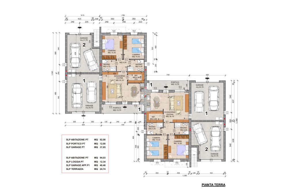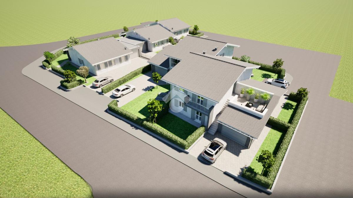 Il progetto prevede due unità site al piano terra con box auto doppio di proprietà e corte esclusiva e due unità che si sviluppano al piano primo, sempre con ingresso indipendente, con accesso all'abitazione tramite la scala interna prevista nell'autorimessa di proprietà.